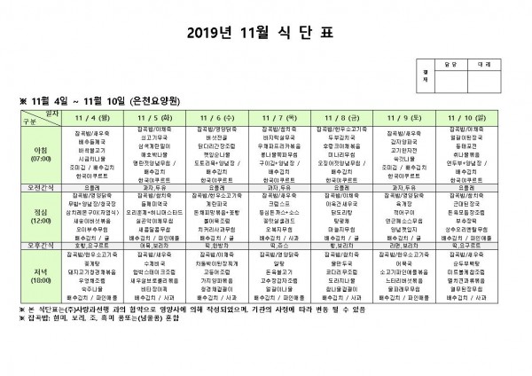 11월 첫째주 식단표 페이지 정보 작성자 은천노인복지회 작성일19-11-12 14:17 조회184,450회 댓글0건 관련링크 이전글 다음글 목록 답변 본문 11월 첫째주 식단표 이전글 다음글 목록 답변