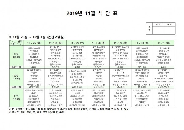 11월 넷째주 식단표 페이지 정보 작성자 은천노인복지회 작성일19-12-02 11:38 조회184,053회 댓글0건 관련링크 이전글 다음글 목록 답변 본문 11월 넷째주 식단표 이전글 다음글 목록 답변
