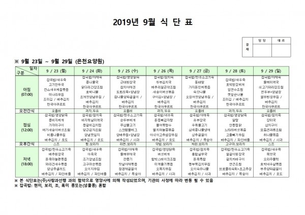 9월 넷째주 식단표 페이지 정보 작성자 은천노인복지회 작성일19-09-30 14:47 조회186,501회 댓글0건 관련링크 이전글 다음글 목록 답변 본문 9월 넷째주 식단표 이전글 다음글 목록 답변