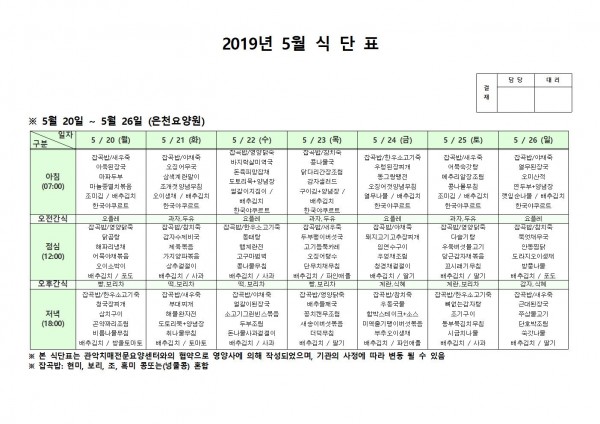 5월 셋째주 식단표 페이지 정보 작성자 은천노인복지회 작성일19-05-27 14:07 조회194,451회 댓글0건 관련링크 이전글 다음글 목록 답변 본문 5월 셋째주 식단표 이전글 다음글 목록 답변
