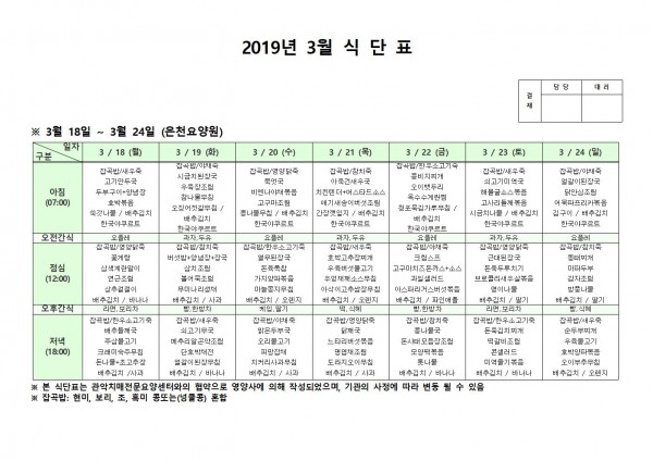 3월 셋째주 식단표 페이지 정보 작성자 은천노인복지회 작성일19-03-25 11:11 조회196,992회 댓글0건 관련링크 이전글 다음글 목록 답변 본문 3월 셋째주 식단표 이전글 다음글 목록 답변
