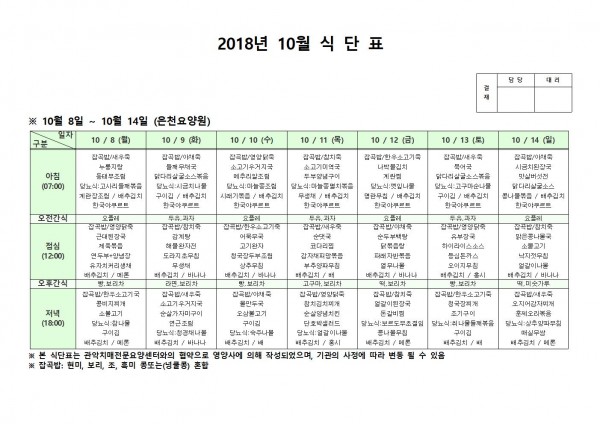 10월 둘째주 식단표 페이지 정보 작성자 은천노인복지회 작성일18-10-19 13:45 조회196,803회 댓글0건 관련링크 이전글 다음글 목록 답변 본문 10월 둘째주 식단표 이전글 다음글 목록 답변