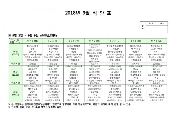 9월 첫째주 식단표 페이지 정보 작성자 은천노인복지회 작성일18-09-11 09:27 조회198,592회 댓글0건 관련링크 이전글 다음글 목록 답변 본문 9월 첫째주 식단표 이전글 다음글 목록 답변