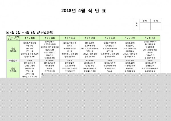 4월 첫째주 식단표 페이지 정보 작성자 은천노인복지회 작성일18-04-02 15:32 조회192,121회 댓글0건 관련링크 이전글 다음글 목록 답변 본문 4월 첫째주 식단표 이전글 다음글 목록 답변