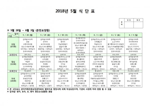 5월 다섯째주 식단표 페이지 정보 작성자 은천노인복지회 작성일18-06-07 10:39 조회198,776회 댓글0건 관련링크 이전글 다음글 목록 답변 본문 5월 다섯쨰주 식단표 이전글 다음글 목록 답변