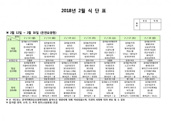 2월 둘째주 식단표 페이지 정보 작성자 은천노인복지회 작성일18-02-12 11:15 조회187,877회 댓글0건 관련링크 이전글 다음글 목록 답변 본문 2월 둘째주 식단표 이전글 다음글 목록 답변