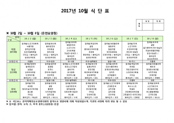 10월 첫째주 식단표 페이지 정보 작성자 은천노인복지회 작성일17-10-11 10:52 조회176,484회 댓글0건 관련링크 이전글 다음글 목록 답변 본문 10월 첫째주 식단표 이전글 다음글 목록 답변