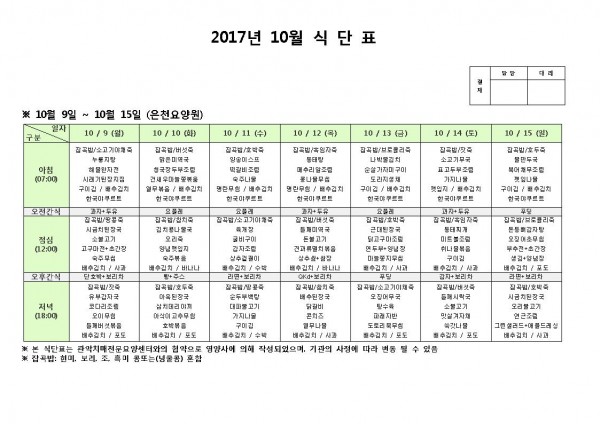 10월 둘째주 식단표 페이지 정보 작성자 은천노인복지회 작성일17-10-17 17:39 조회177,794회 댓글0건 관련링크 이전글 다음글 목록 답변 본문 10월 둘째주 식단표 이전글 다음글 목록 답변