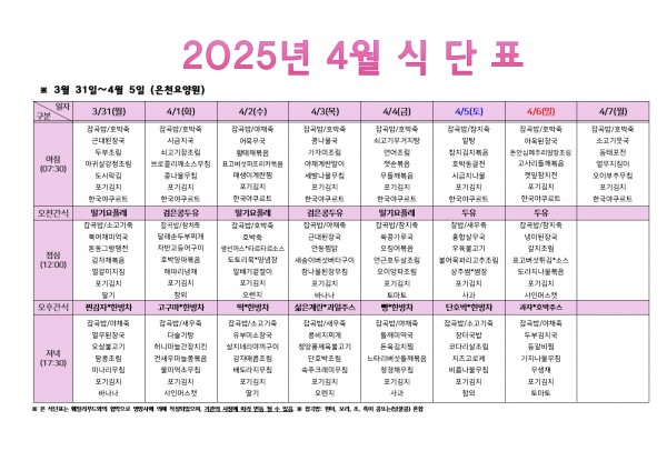2025년 4월 첫주 식단표 페이지 정보 작성자 은천노인복지회 작성일25-03-28 10:25 조회5,965회 댓글0건 관련링크 이전글 다음글 목록 답변 본문 . 이전글 다음글 목록 답변