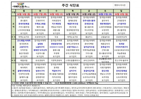 2월 셋째주 식단표 페이지 정보 작성자 은천노인복지회 작성일26-02-12 17:43 조회1,219회 댓글0건 관련링크 이전글 다음글 목록 답변 본문 2월 셋째주 어르신 식단표 안내해 드립니다. 정성과 영양을 담아 준비하겠습니다. 이전글 다음글 목록 답변