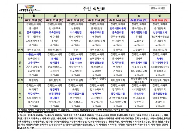 4월 셋째주 식단표 페이지 정보 작성자 은천노인복지회 작성일26-04-16 17:43 조회46회 댓글0건 관련링크 다음글 목록 답변 본문 4월 셋째주 어르신 식단표 안내해 드립니다. 정성과 영양을 담아 준비하겠습니다. 다음글 목록 답변