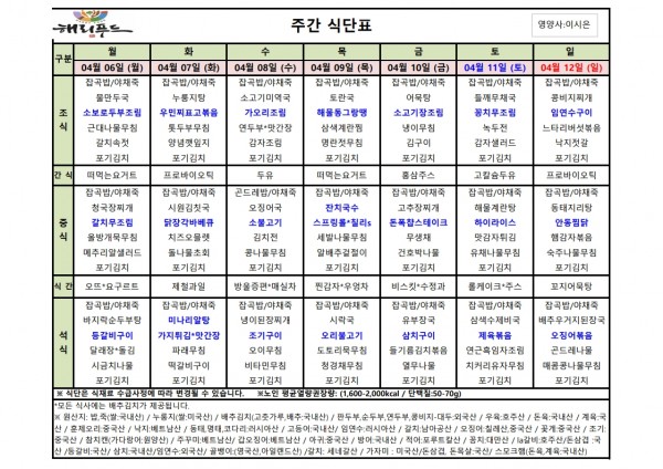 4월 첫째주 식단표 페이지 정보 작성자 은천노인복지회 작성일26-04-03 17:58 조회26회 댓글0건 관련링크 다음글 목록 답변 본문 4월 첫째주 어르신 식단표 안내해 드립니다. 정성과 영양을 담아 준비하겠습니다. 다음글 목록 답변