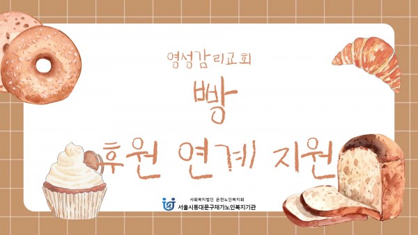 [재가노인지원서비스] 2026년 3월 영성감리교회(빵) 후원 페이지 정보 작성자 은천노인복지회 작성일26-04-06 11:18 조회24회 댓글0건 관련링크 이전글 다음글 목록 답변 본문 기관 인근에 위치한 '영성감리교회'에서 빵(단팥, 소보로, 완두앙금) 200개를 후원해주셨습니다. 이전글 다음글 목록 답변